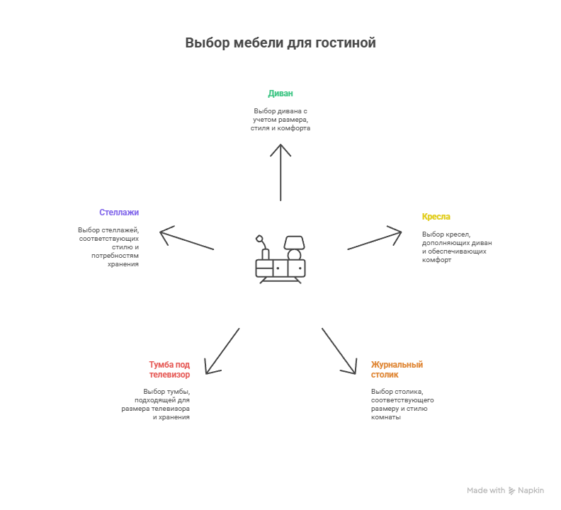 Основные предметы мебели для гостиной включают диван, кресла, журнальный столик, тумбу под телевизор и стеллажи.