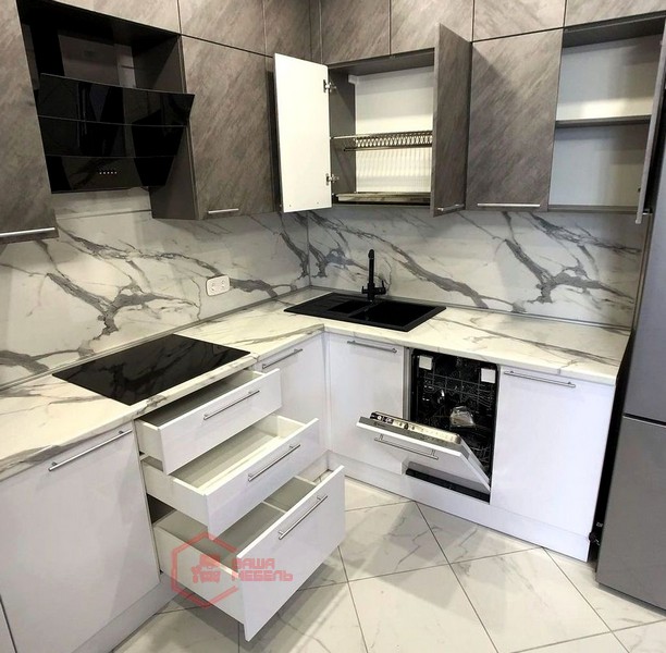 Кухонный гарнитур удобен в использовании – имеет большое количество отделений для вертикального и горизонтального хранения кухонной утвари и различных принадлежностей. Качество отделки и фурнитуры позволит вам оценить эту мебель по достоинству.